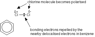As the chlorine molecule approaches a benzene ring, the delocalised electrons in the ring repel the electrons in the chlorine-chlorine bond. That induces a dipole in the chlorine.